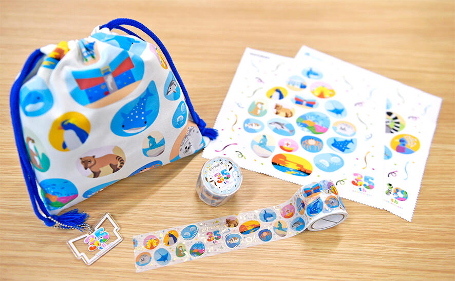 今回販売するオリジナルグッズは、35周年にちなみ35mm幅で製作されたマスキングテープや、2025年11月19日に10周年を迎える海遊館プロデュースの生きているミュージアム「NIFREL(ニフレル)」とのコラボ商品などで、いずれも海遊館の生きものやランドマークがデザインされた35周年を記念する商品となっています。