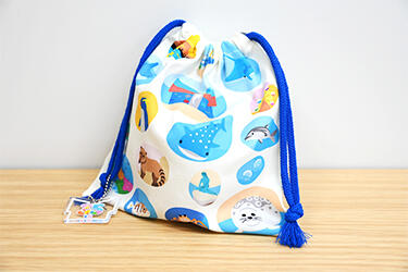 表面には海遊館の生きものたちやランドマークをデザイン、裏面には海遊館の開業日がプリントされた巾着袋です。35周年のシンボルマークをあしらったキーホルダーも付いています。