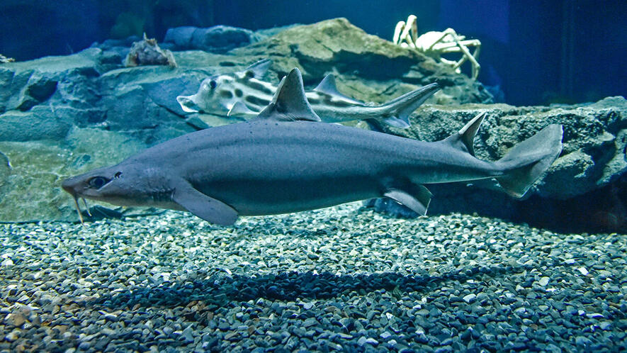 鼻孔前部の長いヒゲと、第一・第二背ビレ前縁の棘が特徴。1度に約10尾の仔を産み、最大で1m程の大きさに成長します。