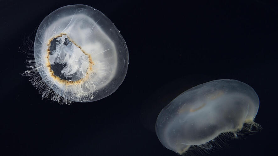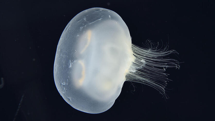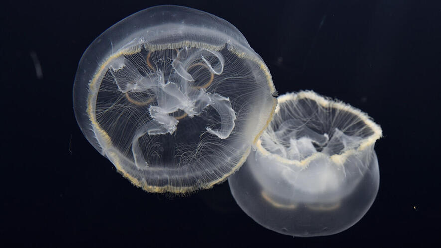 東北地方や北海道に見られる冷水性のクラゲ。ミズクラゲに似るが、傘の縁が褐色に染まることや水管(傘全体に広がる栄養や酸素を運ぶ管)が網目状になること等で区別できます。