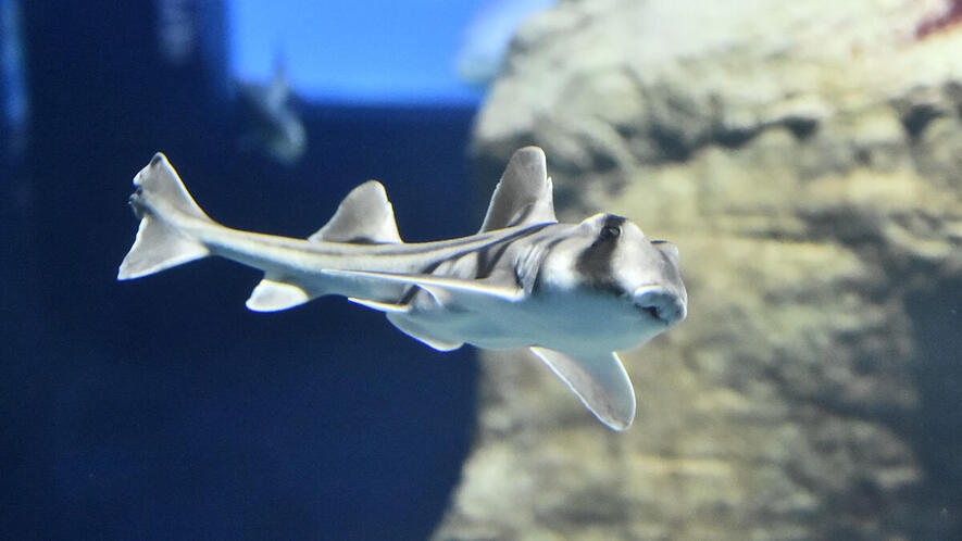 オーストラリア~ニュージーランドに生息するネコザメの仲間で、全長1mになります。黒い線模様が特徴で、背びれの前に棘があります。特殊な歯と強い顎を持ち、貝類を砕いて中身を食べることができます。卵生で、ドリルのようなヒダが付いた形状の卵を洞窟や岩場に産みつけます。孵化まで9~12ヵ月かかります。
