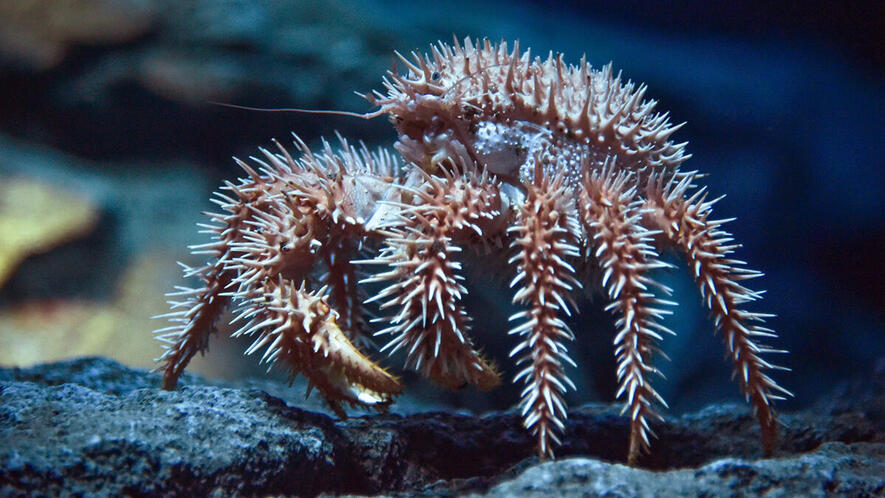 体表は「いがぐり」のように小さな棘で覆われています。名前に「カニ」とありますが、ヤドカリの仲間です。