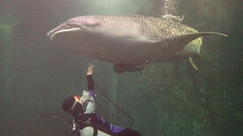 今回は、水族館における「超音波検査」=通称「エコー検査」についてのお話です。超音波検査というと、産婦人科でお腹の中の赤ちゃんの様子を診断する検査といえば分かりやすいかもしれません。超音波は空気中では伝わりにくいので、病院で検査をするときには、トロっとしたゼリーを塗って①プローブ(探触子)を当てて検査をします。これは体とプローブの間に空気の層ができないようにする目的があります。逆に超音波が得意なのは水(液体)。空気中では伝わりにくい超音波ですが、水中では空気中の約5倍の速さ、約1500m/秒で伝播することが知られています。例えば魚群探知機でも超音波が使われていますし、イルカやクジラのエコロケーションも超音波を利用しています。水族館といえば水!つまり、超音波検査は水中で暮らしている生きものに対しては非常に有用な検査方法なのです。水中で検査を実施すれば、魚達を捕まえたり、水から上げる必要がなくなり、検査によるストレスが軽減できるメリットもあります。ただ、超音波検査の機械は精密機器で、水がかかっただけでも壊れてしまいます。ましてや海水は、機械の天敵。だとすれば、機械を丸ごと水から保護してしまえば、水中に持ち込めるのでは?と考えられたのがハウジング作戦です。水中撮影で使用されるカメラは、カメラを水中に持ち込むためにハウジングという専用の防水容器に収納して使用されています。それと同じで、②超音波検査の機械専用のハウジングを使用して、超音波検査を水中で実施したらいいのです。簡単に「専用のハウジングを利用して」と言いましたが、そんなハウジングは残念ながら簡単に手に入れるわけではありません。そこで海遊館では、(一財)沖縄美ら島財団の協力を得て、水中超音波検査を実施しています。海遊館での検査は、まだ試行中。これまで、マンボウやヤイトハタ、シノノメサカタザメやジンベエザメの水中超音波検査を実施しました。今後も、健康管理を目的に水中超音波検査を実施していく予定です。何か大掛かりな機械を水槽に持ちこんでいるダイバーがいたら、それは水中ハウジングを使用した超音波検査をしているのかもしれませんよ。