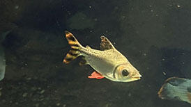 ある朝、「太平洋」水槽を見ていると、ヤジリエイが多くの魚を引き連れて遊泳していました。正面から見るとこんな感じくっついているのはカスミアジです。大きくなると50cmくらいになるアジの仲間で、体側には多くの小黒点があり、第二背鰭・臀鰭・尾鰭が青いので、英名はBluefin trevally(青い鰭のアジ)と呼ばれています。「太平洋」水槽には同じくらいの大きさのギンガメアジがいるのですが、なぜかヤジリエイについているのはカスミアジばっかりでした。それにしてもまあたくさん連なっていること!大名行列かと思ってしまいます。他のヤジリエイはどうだろうと探してみると...あれ?このエイはカスミアジを引き連れてないぞ。くっつこうとしているような1尾はいるけど...たまたま?? 小さいヤジリエイでさえ、数尾ついているというのに。こちらは引き連れるというか、エイの上のを並泳するという感じでした。アジがくっつく条件とはなんぞや?ヤジリエイ3尾の雌雄は上から雌、雌、雄なので、雌雄差ではなさそう。大きさ(数に差はでるけど)でもない。担当者に聞くと、雌のうちどちらかは尾が少し曲がっているそうです。写真を見る限り、どちらがそれにあたるのかはわかりません。次に見る時はそのあたりも確認してみますね。
