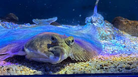 水槽の周りを歩いたり作業をしていたりすると、時折視線を感じることがあります。も、もしかして幽霊!?と視線の方を見ると... きゃ〜!シロワニがこちらを狙ってる!? 生きものたちがこちらを見つめている瞬間、つまりは正面から見た顔を見かけることがあります。 このシロワニは「太平洋」水槽で暮らすサメで、比較的温厚な性格に反して正面から見るととてもイカついお顔をしています。水槽内を悠々と泳ぎ回っているので、ふとした時に正面を向いて泳ぐ姿を見られるかも...?? 次はこちらです。 明らかにこちらを覗き込んでいますね、、?こちらはヤイトハタで、シロワニと同じく「太平洋」水槽の生きものです。この魚も水槽の端っこでジッとしていることが多く、正面のお顔を捉えやすい魚ではありますが、こんなにも下から覗き込んでいる姿はレアです。 続いてはこちら。 「瀬戸内海」水槽よりホウボウです。翼のような形をもった胸びれが特徴的で、胸びれの一部が変化した3対の胸びれ(胸鰭遊離条)でよちよちと歩くように移動する魚です。ジッとこちらを見つめる顔は、何か言いたそうに見えますね(笑) 最後がこちら。 お、怒ってる?? 「北極圏」のツノガレイです。目の後ろにあるツノ状の骨質突起が特徴的で、普段は砂の下に潜りジッとしていることが多いのですが、この時は珍しく砂から出ており、ムッとした口をしてこちらを見ていました(笑)個人的には顔を正面から見られる機会は少ないので、捉えられて嬉しかったです。 皆さんも生きものを見ている時に視線を感じたら振り返ってみてください。私たち飼育員もまだ見た事がない、生きものたちの多彩な顔を見られるかもしれません。