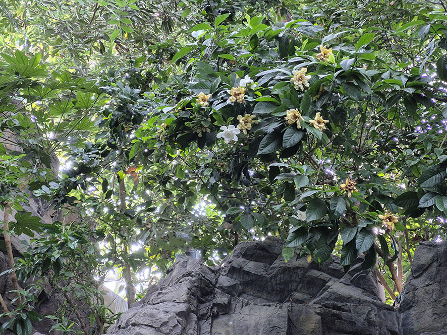 東南アジアに広く分布し、日本では静岡県以西の本州や四国、九州、南西諸島の森林に自生します。温暖でやや湿った半日陰の場所を好みますが、園芸種として用いられることも多く、海遊館に来る途中の街路でも見られます。道端で香りと花の姿を見かけたら、少し遅れて「日本の森」で花が開きます。