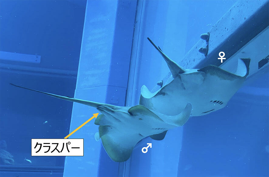 トラフザメを含むサメ・エイの仲間は通常、おなか側のヒレ(腹ビレ)にある "クラスパー" の有無で簡単にオスメスが見分けられます。クラスパーはオスの特徴で、交尾の時に活躍する器官なのです。