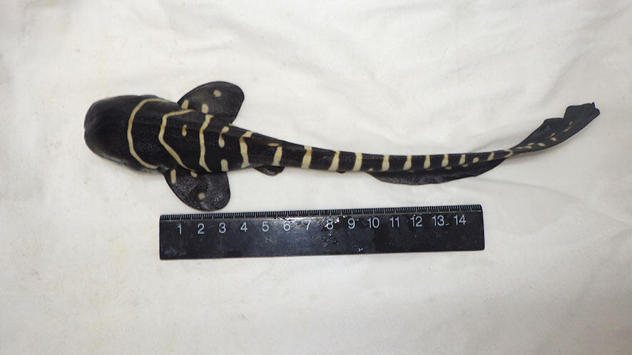 トラフザメはインド洋から太平洋にかけて広く生息する底生のサメで、幼魚のころはシマシマ模様から英語では "zebra shark(シマウマ(模様の)サメ)" なんて呼ばれることもあります。ちなみに和名の "トラフザメ" は "トラ斑(ふ)のサメ" が由来といわれており、成長に合わせて由来の生きものが変わるのも面白い特徴の一つです。