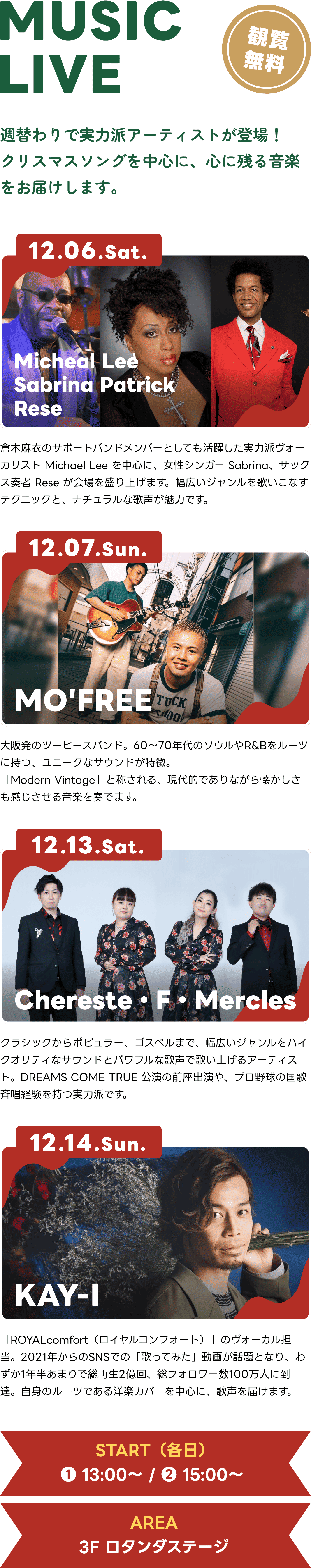 倉木麻衣のサポートバンドメンバーとしても活躍した実力派ヴォーカリスト Michael Lee を中心に、女性シンガー Sabrina、サックス奏者 Rese が会場を盛り上げます。幅広いジャンルを歌いこなすテクニックと、ナチュラルな歌声が魅力です。